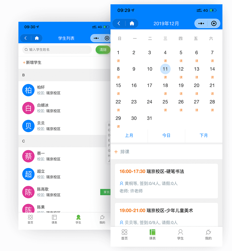 - 查看课表,点名, 课消, 作业情况. 提交作业